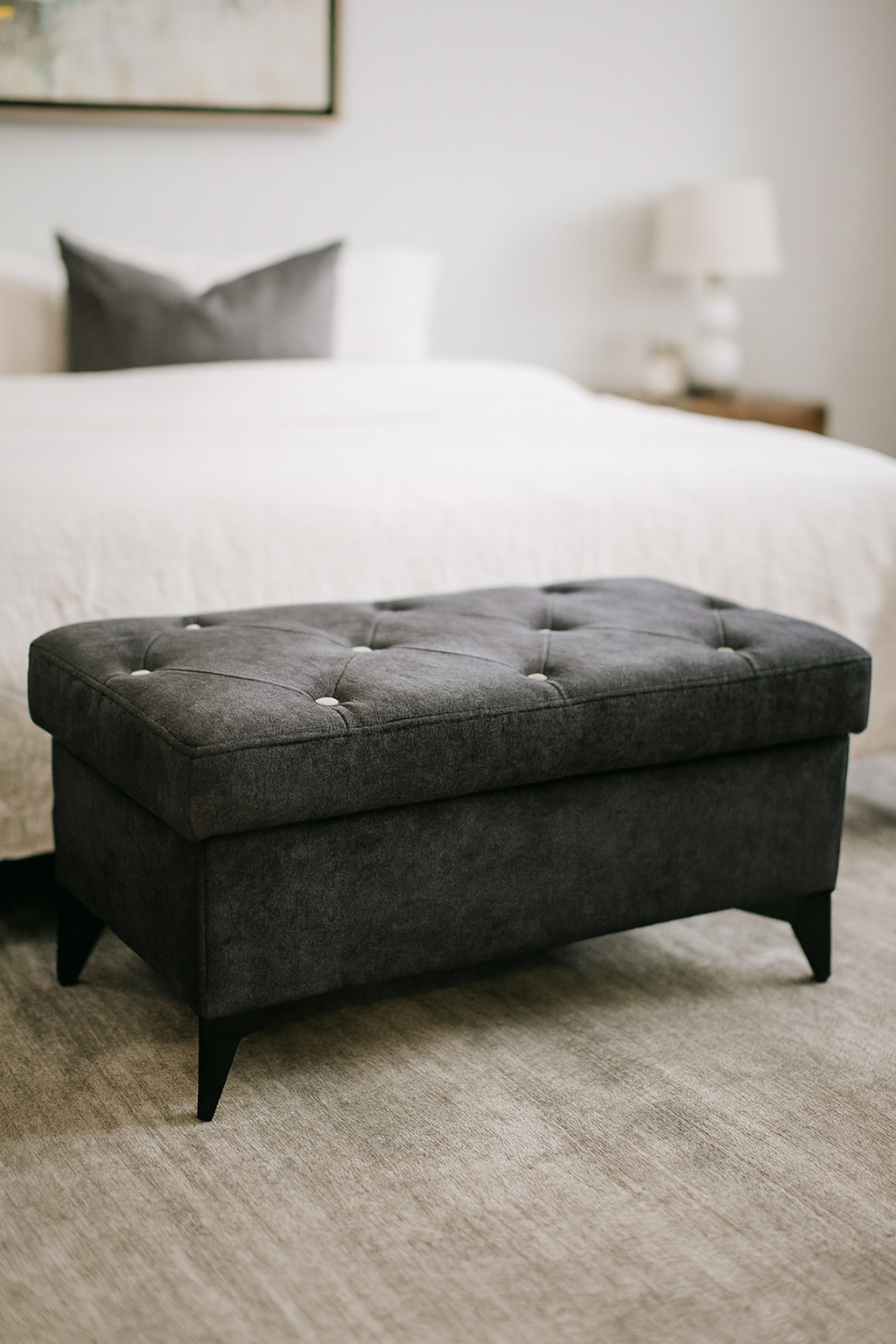 ✔ Funkcjonalny schowek – praktyczny pojemnik wewnątrz pomieści koce, poduszki czy inne akcesoria, pomagając utrzymać porządek w sypialni lub salonie.
